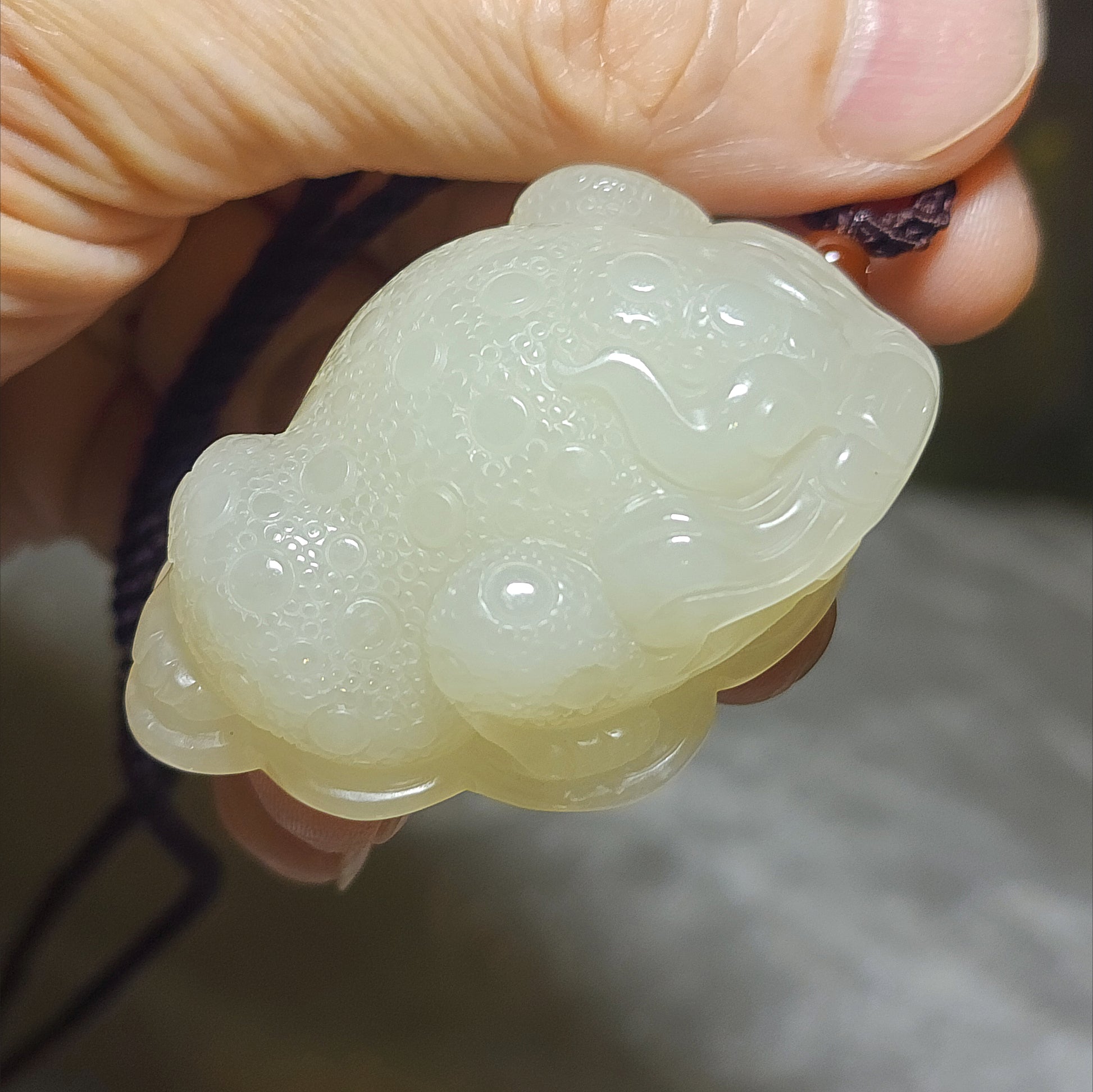 ♡Skillfully carved on a good transparency warm white Nephrite, a three dimensional 3 Legged Toad, a mythical animal many believe improving money luck. A rare piece to be added to one's collection.